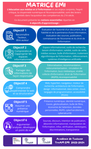 Dans cet esprit, ce travail de repérage des compétences et notions liées à l’EMI a été réactualisé en 2024 par un groupe de travail interdisciplinaire élargi aux participants des TraAM EMI. Il reprend les éléments structurants de notre contexte informationnel et sociétal et donne une nouvelle place aux questions vives telles que le cyberharcèlement et l’intelligence artificielle.L’objectif de la matrice EMI de l’Académie de Toulouse est de donner un cadre d’appui aux professeurs documentalistes et à l’ensemble des enseignants pour intégrer l’EMI à leurs séances pédagogiques : définir des objectifs et un vocabulaire commun mais également structurer les parcours EMI dans les établissements.